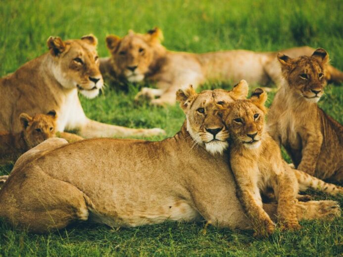 Početná skupina lvic a lvíčat se jde přivítat s dospělým samcem